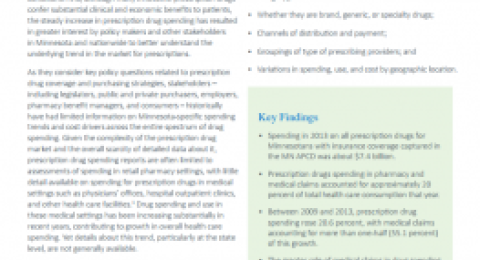 The Minnesota Department of Health utilized claims data from the Minnesota All-Payer Claims Database (MNAPCD) to analyze pharmaceutical spending and use in the state between the years 2009 and 2013. After looking at trends in the number of drug claims, total spending, and spending per claim, this issue brief found that in the five year span, prescription drug spending rose 20.6 percent, with medical claims accounting for more than one-half (55.1 percent) of this growth. The study highlights how focusing only on pharmacy settings gives an incomplete, and potentially misleading, picture of drug spending and use trends and encourages future research to account for all sources of prescription drug spending.